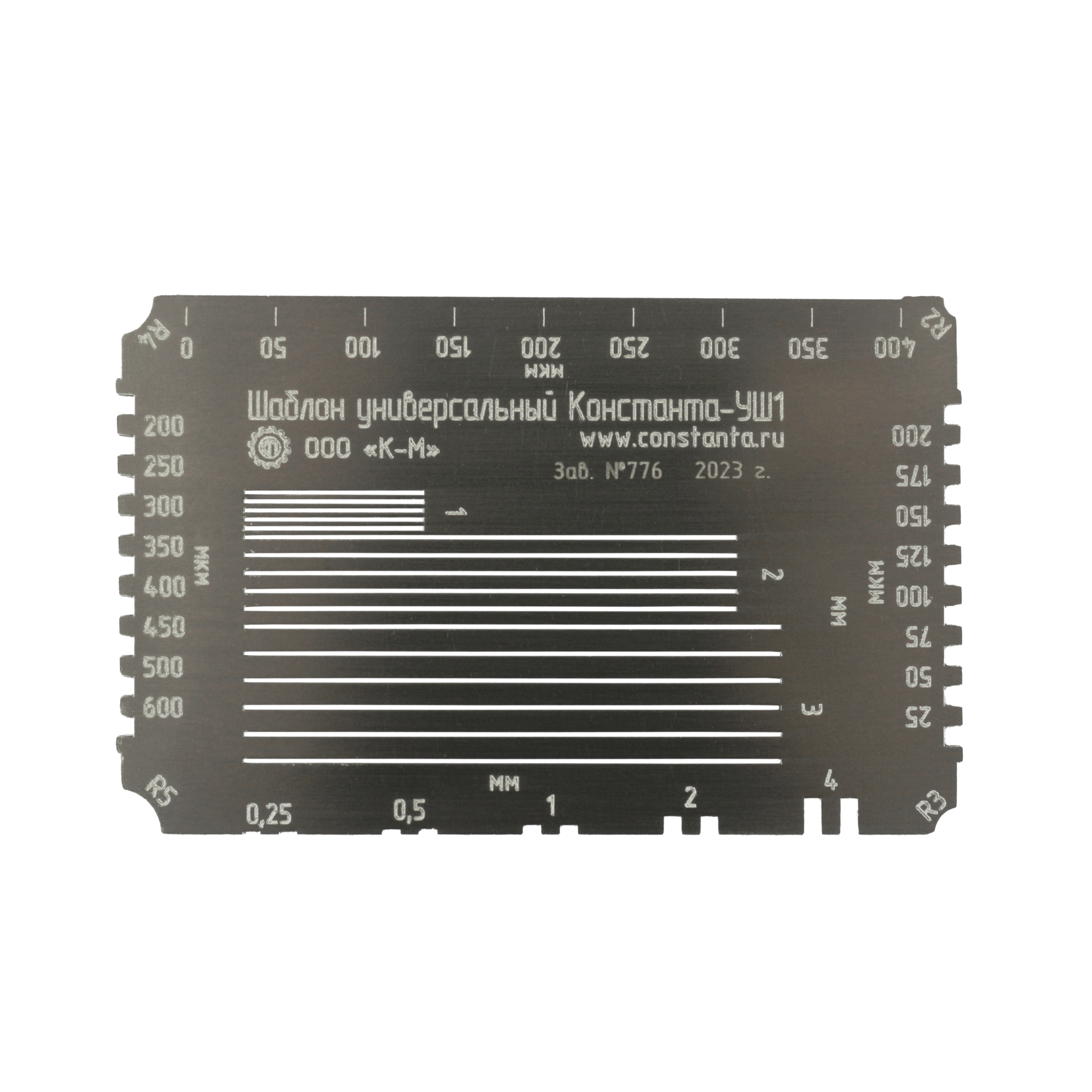 - конструктивное исполнение в виде шаблона, изготовленного из пластины нержавеющей стали, с радиусами закругления краев 2, 3, 4, 5 мм и прорезями с шагом 1, 2 и 3 мм