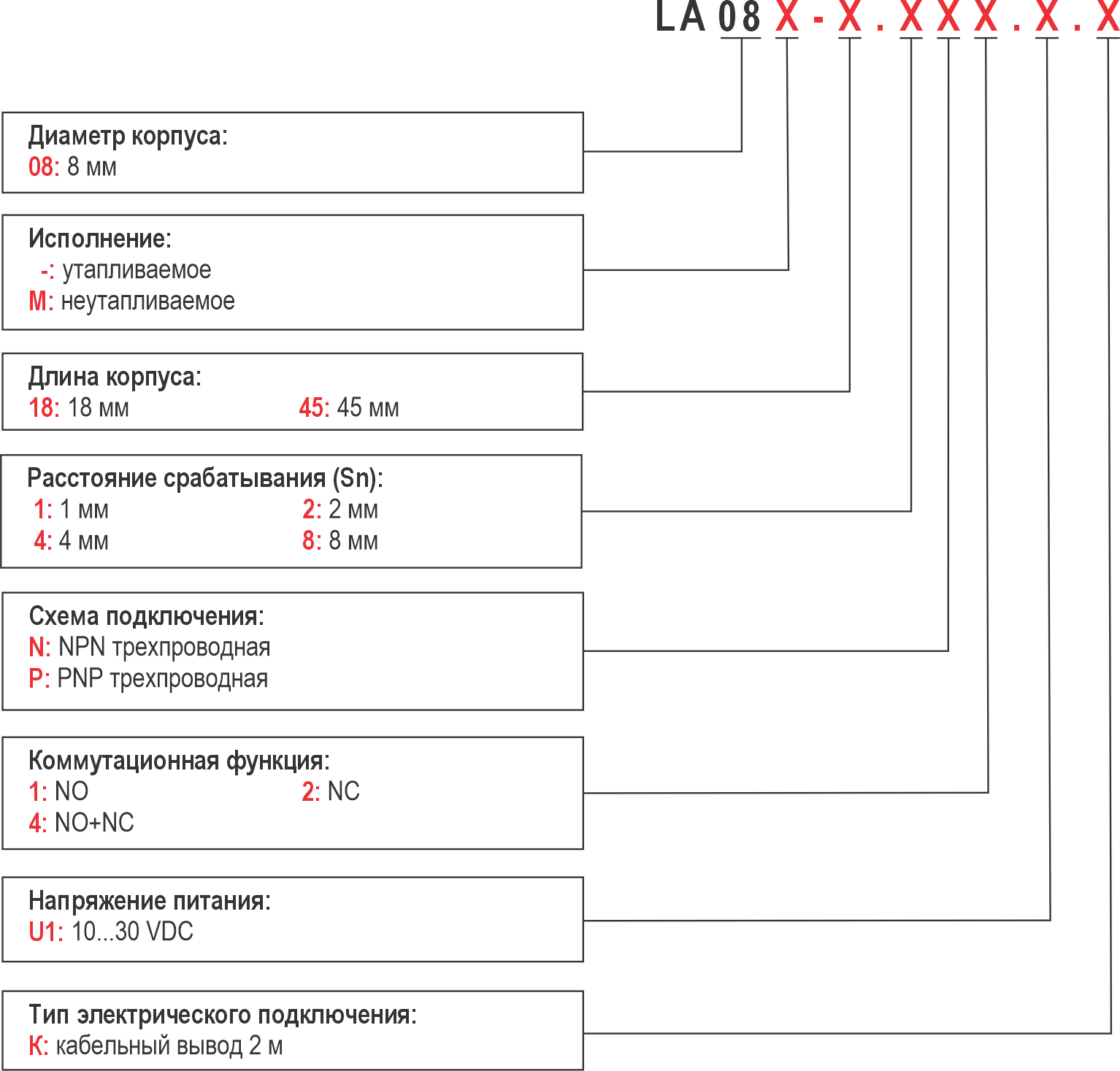 Индуктивные бесконтактные выключатели KIPPRIBOR серии LA – это датчики, выполненные в цилиндрическом корпусе, реагирующие на приближение металлического предмета (объекта) к их чувствительной части. Чувствительная часть индуктивного датчика KIPPRIBOR серии LA расположена с торца и защищена пластиковым колпачком. Номинальное расстояние срабатывания (Sn) датчиков LA зависит от модификации и может составлять 2, 4, 5, 8, 10, 15 мм.