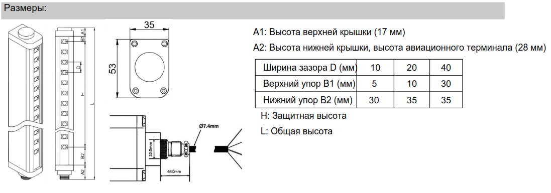 Устройство изготовлено в прочном корпусе с высокой степенью пылевлагозащиты. Подключается через кабель с разъемом. Соответствует требованиям типа 4 по IEC 61496 и обеспечивает уровень эффективности защиты pl e.