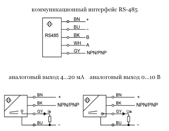 Датчик подключается через кабель 2 м и имеет дополнительный цифровой выход PNP/NPN. Напряжение питания— 12-24 DC. Оснащен интерфейсом RS-485 для удаленной передачи сигнала и возможности применения в автоматических измерительных системах.