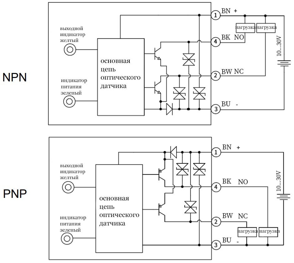 Питание 12-24 DC, подключение осуществляется через разъем М8. Сигнал на выходе — типа NPN, срабатывает NO+NC.