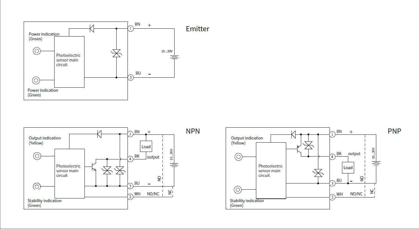 Питание 12-24 DC, подключение осуществляется через разъем М12. Сигнал на выходе — типа PNP, срабатывает на свет/на затемнение.